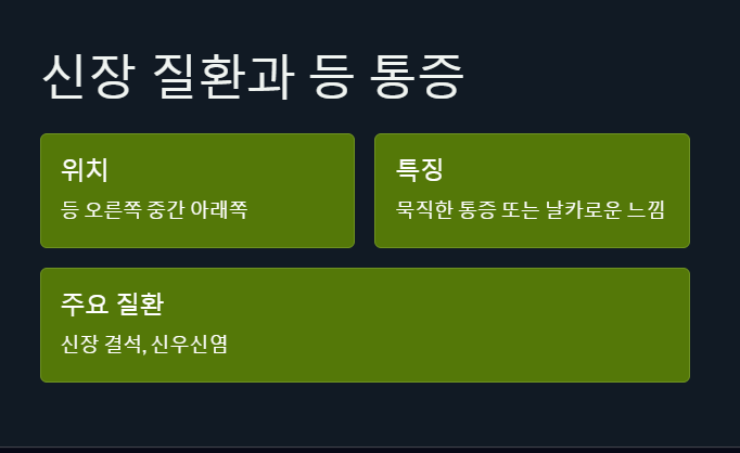 등은 단순히 근육으로만 구성된 부위가 아니에요. 신장, 간, 췌장, 담낭 같은 주요 장기들이 인접한 위치에 있기 때문에, 내부 장기 이상이 외부 통증으로 나타나는 경우가 종종 있어요. 특히 신장 질환이 있을 때는 등 오른쪽 중간 아래쪽에 묵직한 통증이나, 찌르는 듯한 날카로운 느낌이 생기기도 해요. 신장결석이나 신우신염처럼 염증이 있는 경우에는 등 통증과 함께 소변 이상, 발열, 오한 같은 증상이 함께 나타날 수 있어요. 또한 담낭 질환이나 간 기능 저하도 등 통증의 원인이 될 수 있어요. 담석이 있거나 간에 염증이 생기면, 오른쪽 등 아래쪽에서 둔한 통증이 반복될 수 있죠.