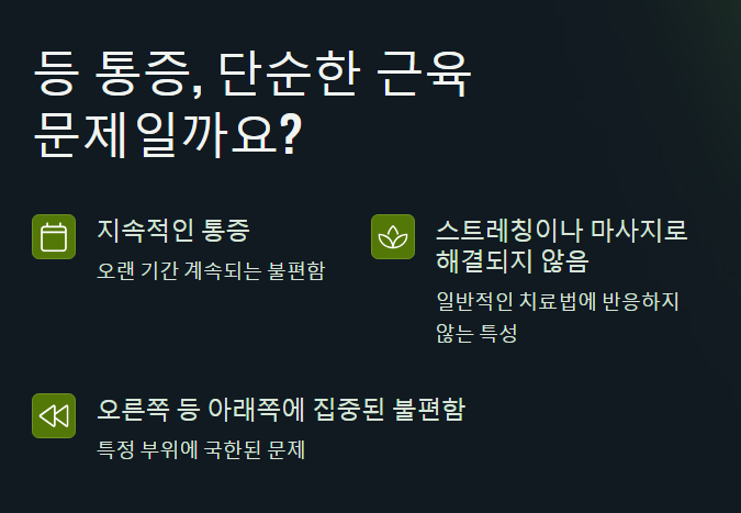 이런 경우엔 통증이 반복되거나, 누웠을 때 더 심해지는 양상으로 나타나는 경우가 많아요. 가볍게 생각하고 넘기기보다는,물리치료사나 정형외과 전문의의 진단을 통해 척추 상태를 한 번 확인해보는 것이 좋아요.