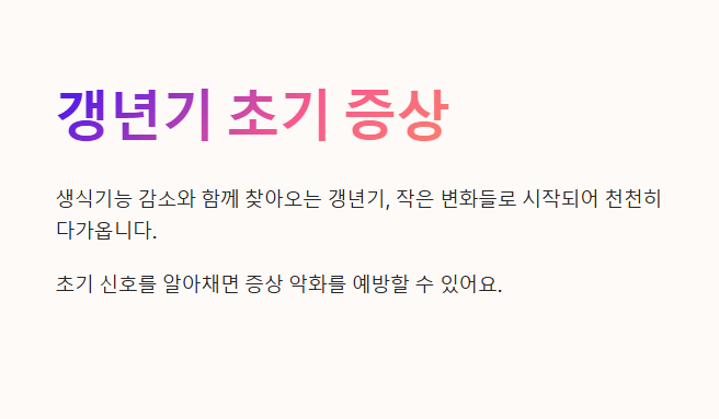 이런 고민이 반복된다면 단순 피로나 기분 탓으로만 넘기지 마세요. 특히 일상 속 피로와 감정 기복이 전보다 심해졌다면,갱년기의 시작을 알리는 신호일 수 있어요. 갱년기는 갑작스럽게 오는 것이 아니라, 작고 사소한 변화들로 시작돼 천천히 다가오는 시기예요. 초기에 몸이 보내는 신호를 알아채지 못하면 불면, 우울감, 호르몬 불균형 같은 증상들이 더 악화될 수 있어요. 지금부터 갱년기 초기증상이 어떤 모습으로 나타나는지, 그리고 어떻게 대응하면 좋은지 함께 알아볼게요.