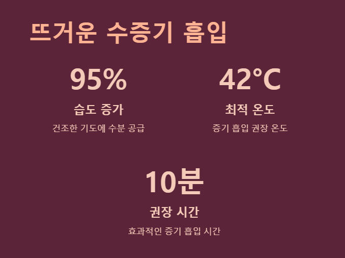 이때 유칼립투스 오일이나 페퍼민트 오일을 1~2방울 떨어뜨리면 호흡기 진정 효과가 더 좋아져요. 단, 너무 뜨거운 수증기는 화상의 위험이 있으니 거리를 조절해 주세요.