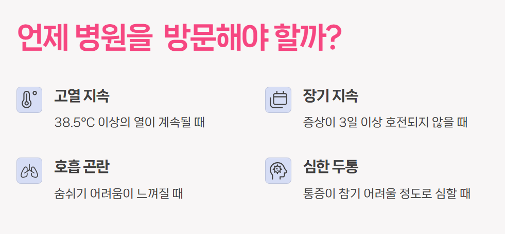 초기 대응에도 불구하고 증상이 3일 이상 지속되거나, 다음과 같은 상황이 발생한다면 병원 진료가 필요합니다.