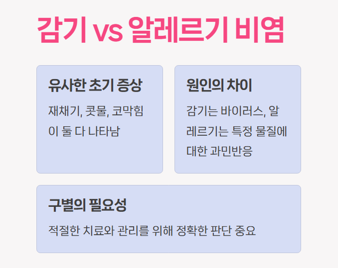 이렇게 네 가지 증상이 반복적으로 나타나는 것이 특징입니다. 감기와 가장 큰 차이는 열이 없고, 근육통이나 전신 피로감도 거의 없다는 점입니다. 따라서 단순히 재채기만 계속되거나 특정 환경에서만 증상이 나타난다면, 감기보다는 알레르기 가능성이 높다고 볼 수 있습니다.