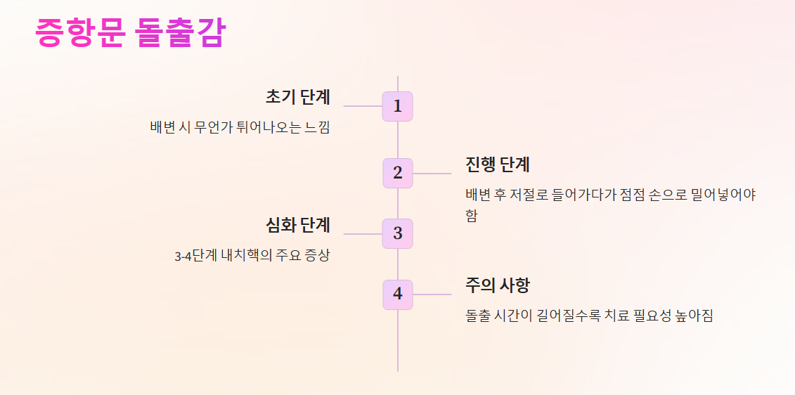 배변 시 항문에서 살이 튀어나오는 듯한 느낌은 치핵(내치질)의 진행 단계일 수 있습니다.