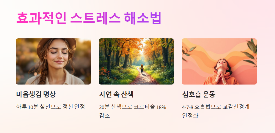 운동, 명상, 취미 활동, 가벼운 산책 등 자신에게 맞는 스트레스 해소법을 찾아보세요.