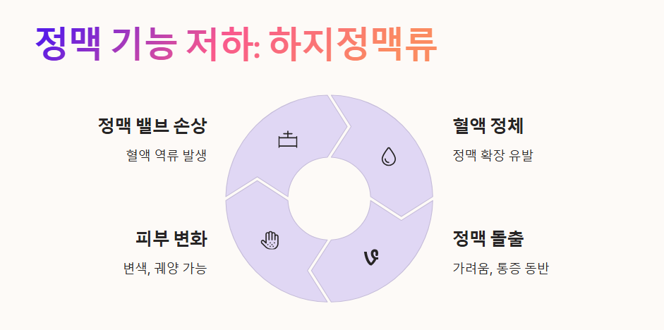 • 정맥 판막이 망가지면서 혈액이 역류하고 정체되며 붓기와 통증을 유발합니다.