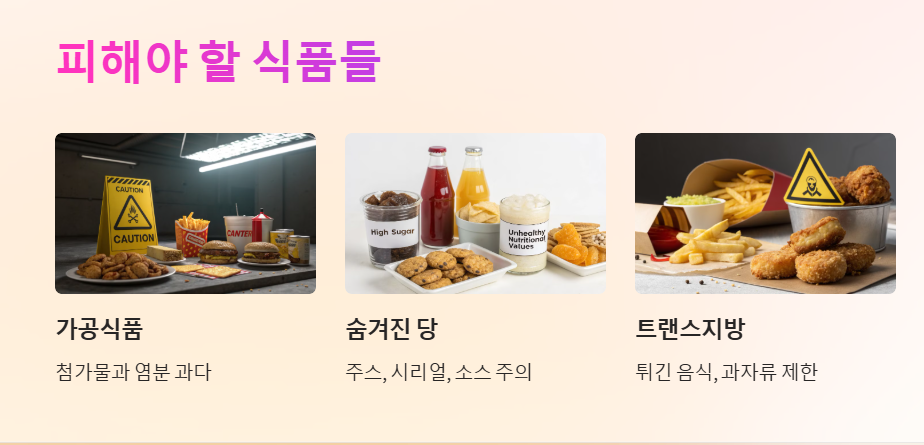 • 트랜스지방(과자, 튀김류, 마가린 등) 완전 배제