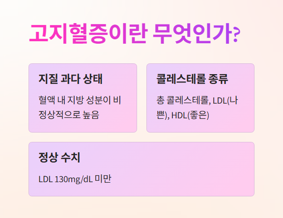 고지혈증은 혈액 속 지질(지방) 성분이 비정상적으로 높은 상태를 말하며, 주로 아래 네 가지 지표를 통해 확인합니다.