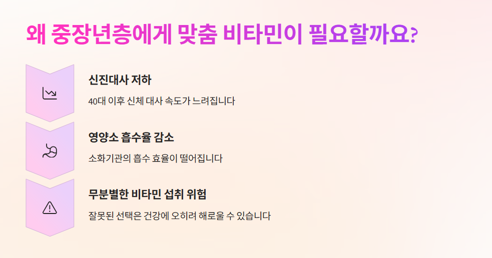 40대 이후부터는 신진대사 속도가 느려지고, 각종 영양소의 흡수 효율도 떨어지게 됩니다. 식단만으로는 충족하기 어려운 영양소가 많아지면서, 많은 분들이 종합비타민에 의존하게 되죠. 하지만 무조건 이름만 보고 비타민을 고르다 보면 과도한 성분 섭취나 불필요한 복용이 될 수 있습니다. 이 글에서는 중장년층에게 꼭 필요한 비타민 성분, 영양제 고를 때 체크해야 할 기준, 나에게 맞는 제품을 선택하는 팁을 정리해드립니다.