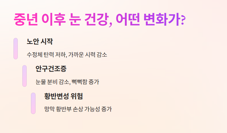 40대 이후부터는 눈 속 수정체가 단단해지고 망막 기능도 서서히 약해지기 시작합니다. 특히 다음과 같은 변화가 눈 건강에 영향을 줍니다.