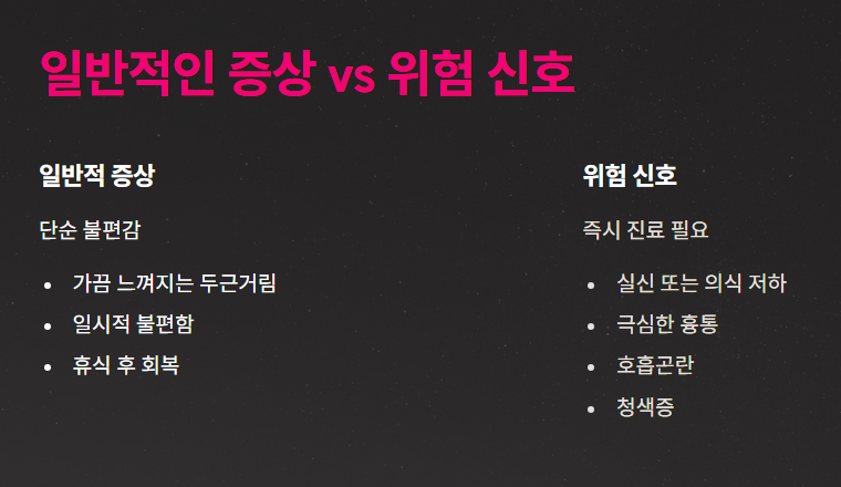 특히 갑작스러운 실신, 극심한 피로감, 운동 중 호흡 곤란이 나타나는 경우, 즉시 병원을 방문해야 합니다. 이는 심장의 펌프 기능 이상과 관련된 심각한 신호일 수 있습니다.