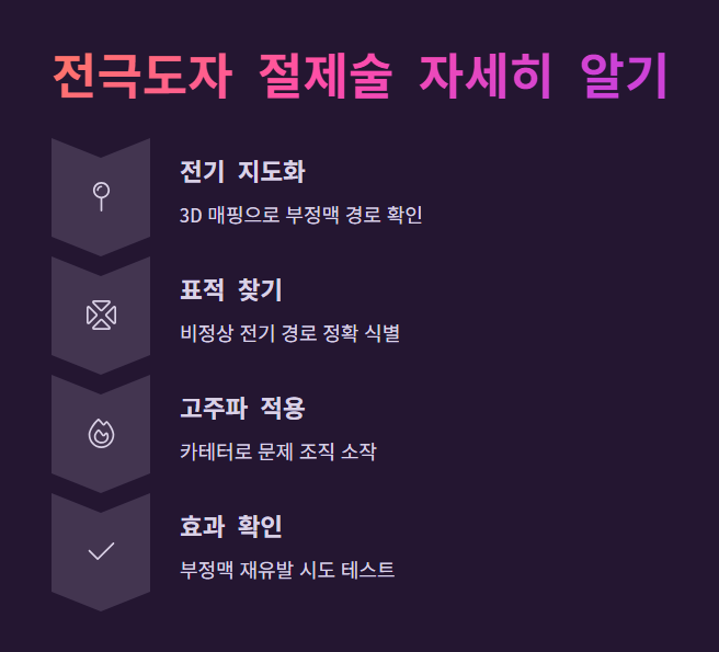 약물치료에 반응이 없거나, 근본적인 원인을 제거하고자 할 때 선택되는 대표적인 시술이 전극도자 절제술입니다. 전극을 심장 안으로 삽입하여 부정맥을 일으키는 비정상 전기 신호 부위를 고주파로 태워 제거하는 방식입니다.