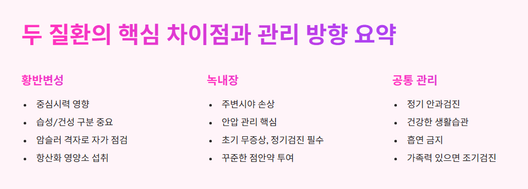 • 공통 관리법: 항산화제 섭취, 루테인·지아잔틴 보충, 자외선 차단