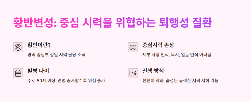 • 황반변성: 중심 시야 손실로 삶의 질 저하가 크지만, 조기 치료 시 효과적