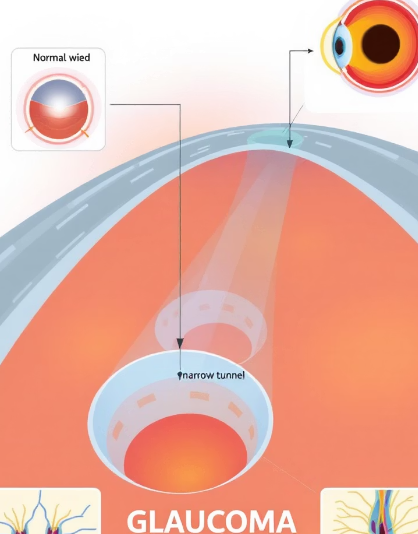 • 녹내장: 주변 시야가 좁아지며 말기엔 중심 시야만 남게 됨
