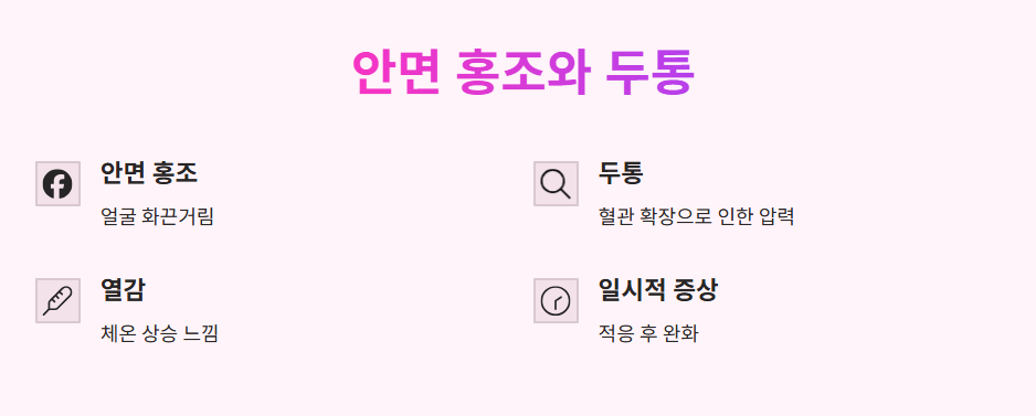 • 안면홍조: 얼굴이 화끈거리고 열이 나는 듯한 느낌