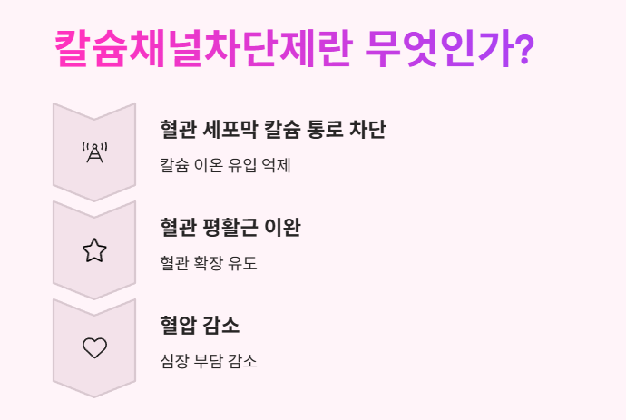 칼슘채널차단제는 혈관 평활근으로 유입되는 칼슘 이온을 차단하여 혈관을 이완시키고 혈압을 낮추는 역할을 합니다. 고혈압 치료제 중 하나로, 장기 복용이 필요한 경우가 많습니다.