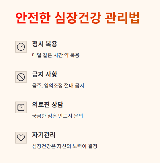 심장약은 대부분 지속적인 복용을 전제로 작용합니다. 상태가 나아졌다고 스스로 끊거나 건너뛰는 것은 심각한 부정맥, 혈압 급변, 심부전 악화로 이어질 수 있습니다.