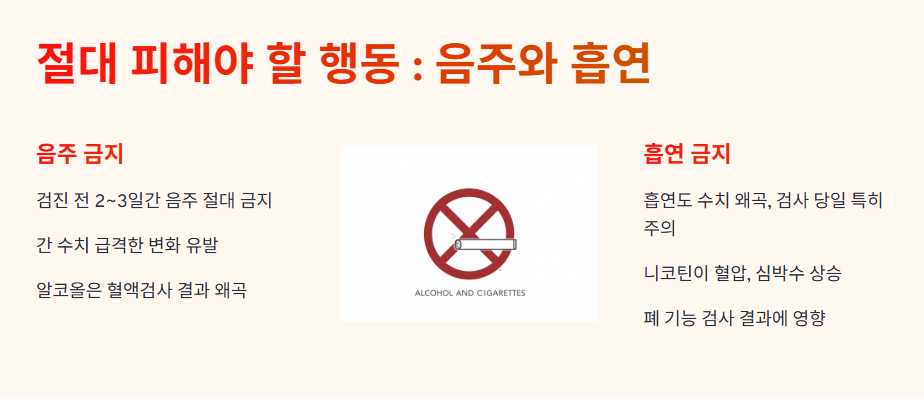 검진 전날 무심코 한 행동이 결과를 왜곡시킬 수 있습니다. 특히 다음 항목은 검사 수치에 직접 영향을 줄 수 있으므로 반드시 피해야 합니다.