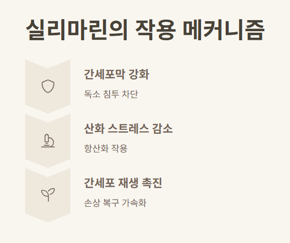 밀크씨슬의 핵심은 실리마린이라는 플라보노이드 복합 성분입니다. 이 성분은 간세포를 안정화시키고, 체내 해독 작용을 촉진하여 간에 부담을 덜어주는 데 효과적입니다.
