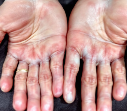 • 손가락, 손목, 발가락 관절이 붓고 눌렀을 때 통증이 있다
