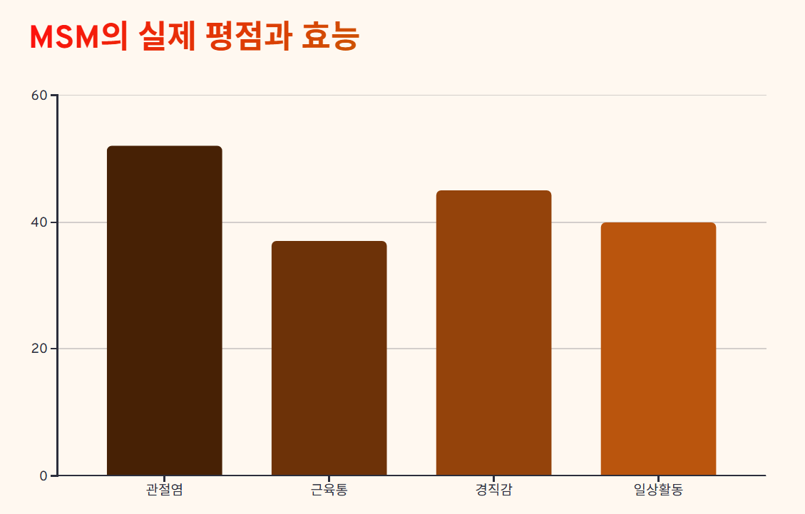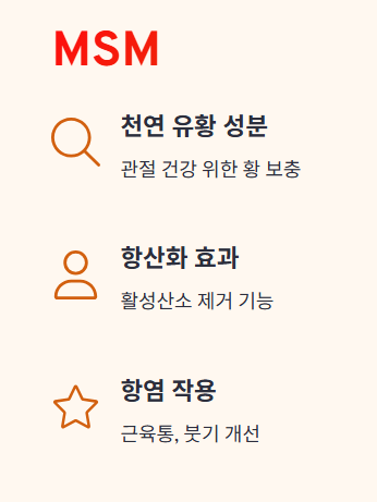 MSM은 유기 황 화합물로 관절염에서 자주 언급되는 통증 완화 성분입니다. 항염 작용을 하며 조직 재생을 도와 관절염 외에도 근육통, 인대 통증에도 유용하게 쓰입니다.