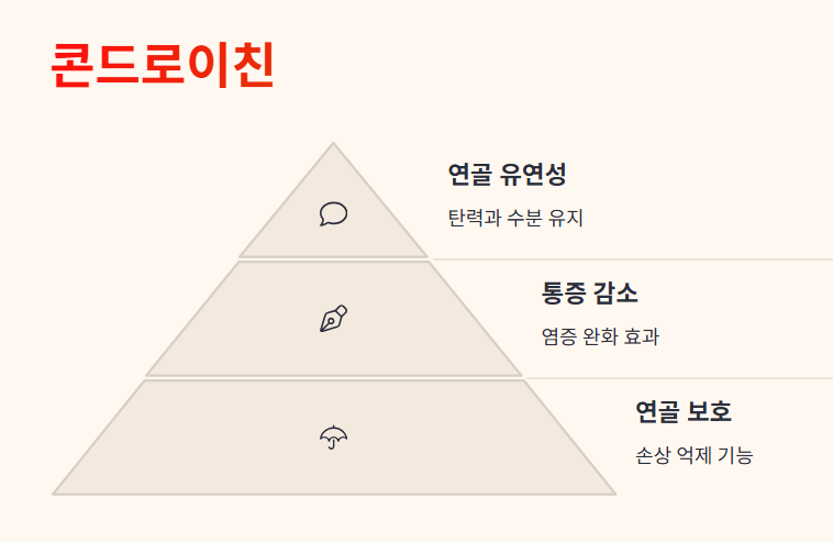 콘드로이틴은 글루코사민과 함께 자주 처방되는 성분으로, 연골이 수분을 유지하도록 도와주고 충격을 흡수하는 능력을 높입니다. 단독보다는 글루코사민과 병행할 때 효과가 극대화됩니다.