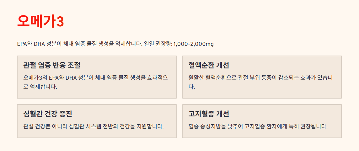 오메가3는 전신의 염증 반응을 낮추는 데 탁월한 작용을 하며, 특히 류마티스관절염 환자에게 긍정적인 효과를 보입니다. 식물성보다는 어유 기반이 항염 효과가 더 뛰어납니다.
