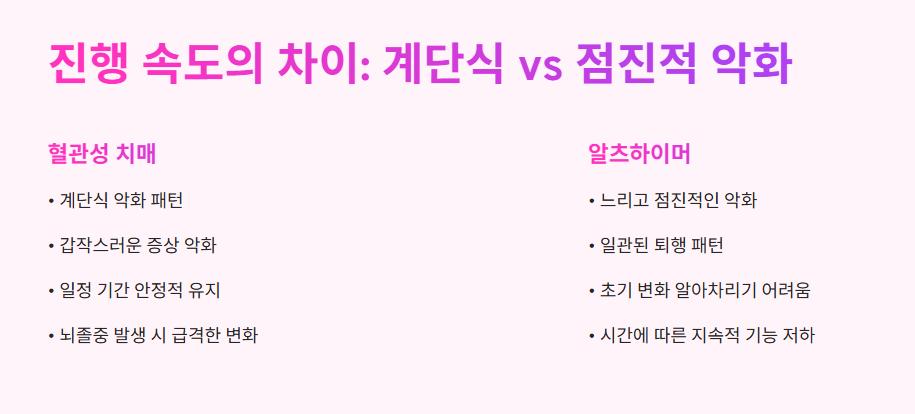 두 치매 모두 인지기능 저하가 공통점이지만, 나타나는 속도와 증상의 패턴에서 큰 차이가 있습니다.