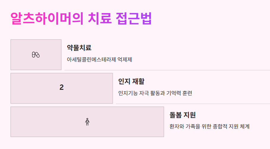 • 알츠하이머는 뇌 기능 유지와 항치매 약물 복용이 중심