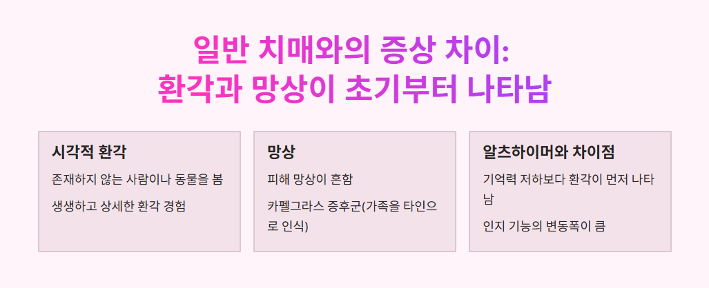 두 질환 모두 인지 저하를 동반하지만, 루이소체 치매는 초기부터 뚜렷한 비인지적 증상이 나타나는 것이 특징입니다.