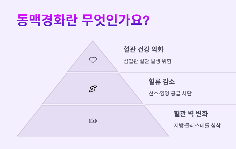 동맥경화는 혈관 안쪽 벽에 지방과 콜레스테롤이 쌓이면서 혈관이 좁아지고 탄력을 잃는 상태를 의미합니다.