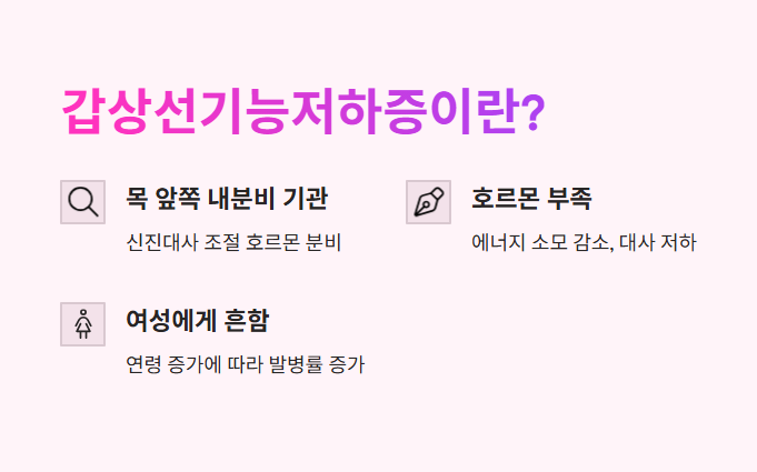 갑상선에서 생성되는 호르몬이 부족해져 신진대사 속도가 느려지는 질환입니다. 에너지가 감소하고 몸 전체 기능이 둔해지는 증상이 동반됩니다.