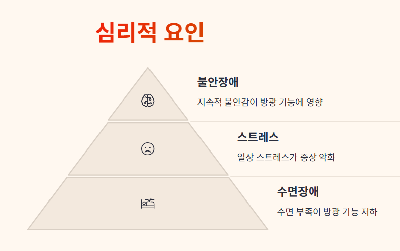 과민성 방광은 명확한 하나의 원인으로 발생하지 않습니다. 심리적 요인부터 신경계 이상까지 복합적으로 작용합니다.
