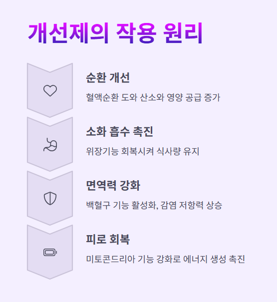• 소화 흡수 촉진: 위장기능을 회복시켜 식사량 유지
