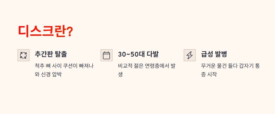 디스크는 비교적 급성으로 시작되는 경우가 많아 빠른 진단이 중요합니다.