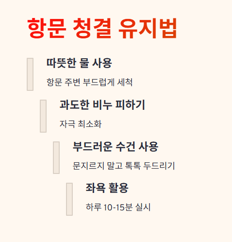 • 항문 청결을 따뜻한 물로 유지하고 과도한 비누 사용은 피하기