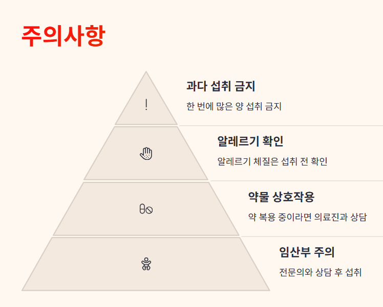 자연 성분이지만 과다 섭취 시에는 위장 불편이나 알러지 반응이 나타날 수 있습니다.