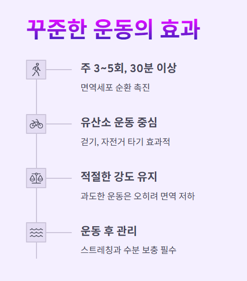 적절한 운동은 면역세포의 순환과 활성도를 증가시켜 몸을 더 강하게 만들어줍니다.