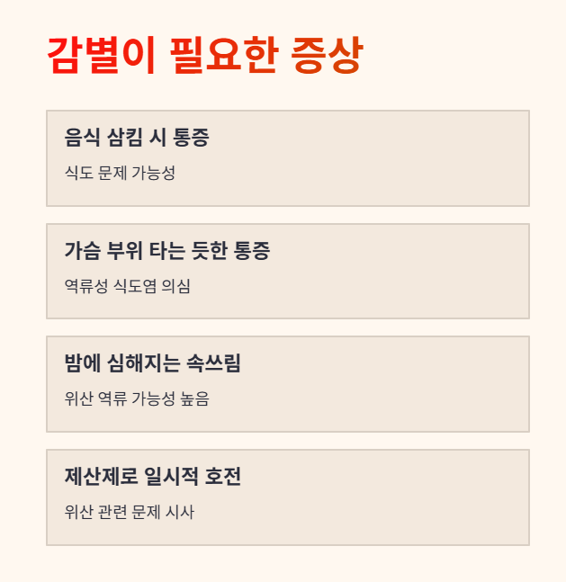 모든 속쓰림이 같은 원인은 아닙니다. 다음과 같은 증상은 병적 상태일 가능성이 있으므로 감별이 중요합니다.