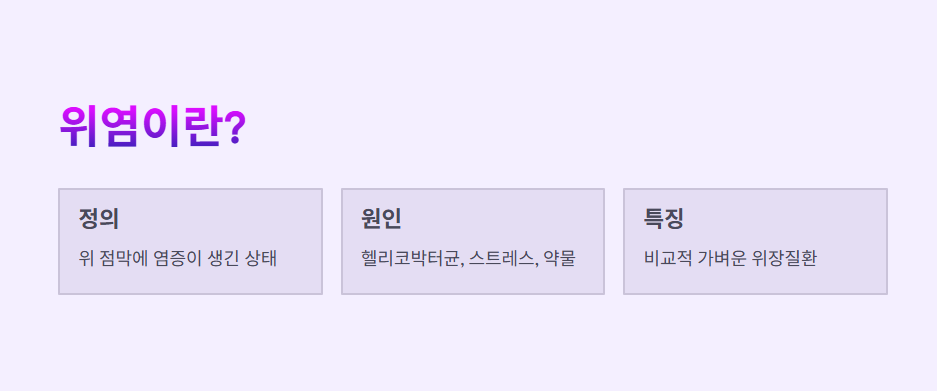 위염은 위 점막에 염증이 생긴 상태로, 비교적 가벼운 위장질환에 속합니다.