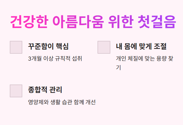 • 비타민C, 아연, 오메가3와 함께 복용 시 피부 개선 효과 상승