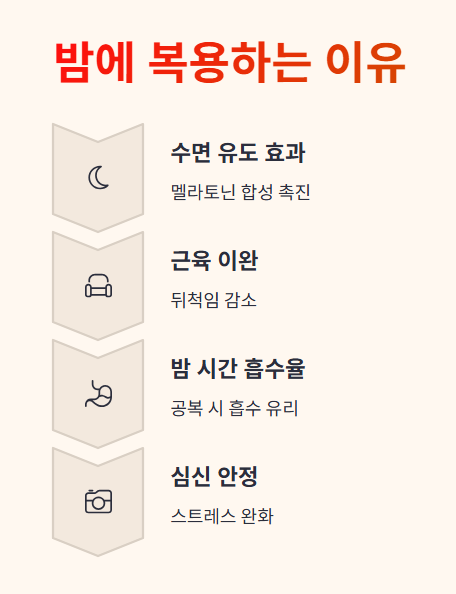 특히 마그네슘은 수면에 관여하는 신경을 안정시키는 데 중요한 작용을 하며, 밤 시간에 섭취할 때 효과를 더 볼 수 있습니다.
