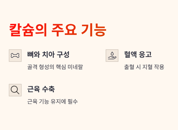 • 칼슘: 뼈와 치아 구성, 혈액 응고, 근육 수축
