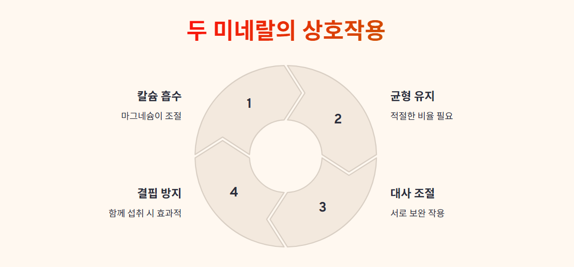 • 상호작용: 마그네슘이 칼슘 흡수와 대사 조절에 관여